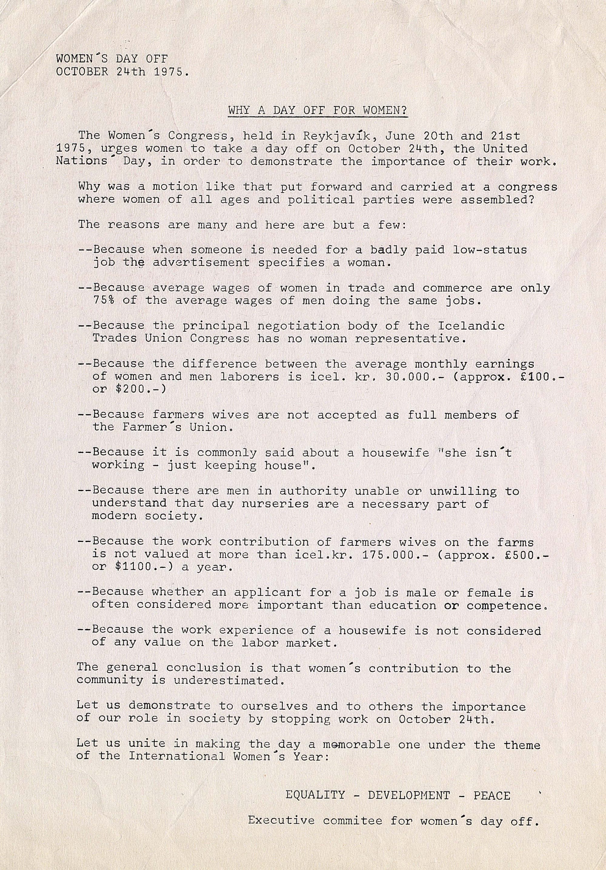 1975년 6월 20일과 21일 레이캬비크에서 열린 여성 회의는 여성들의 노동의 중요성을 보여주기 위해 10월 24일 유엔의 날에 하루 휴무할 것을 촉구합니다.